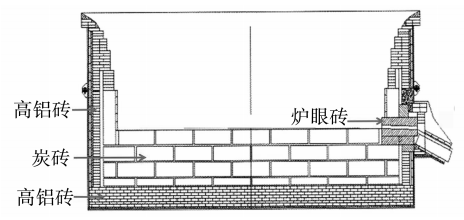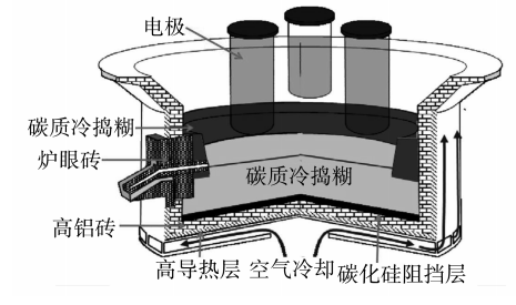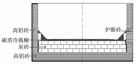 为了解决耐火砖间的砌缝问题,Elkem公司提出了整体内衬的炉衬结构,如图2所示,它的工作层采用不定形耐火材料(冷捣糊)整体捣打成型,然后通过烘炉将其烧结成一个整体。